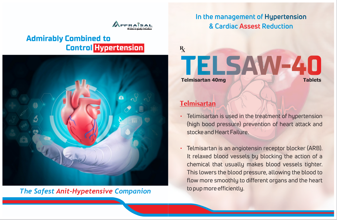 Telmisartan is used in the treatment of hypertension (high blood pressure), prevention of heart attack and stroke, and Heart Failure.